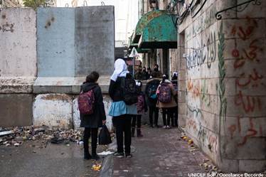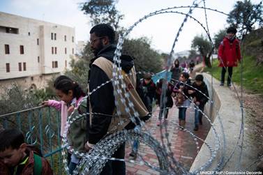 Above: A UNICEF- supported EEPI volunteer walks Palestinian students past barbed wire outside Cordova school